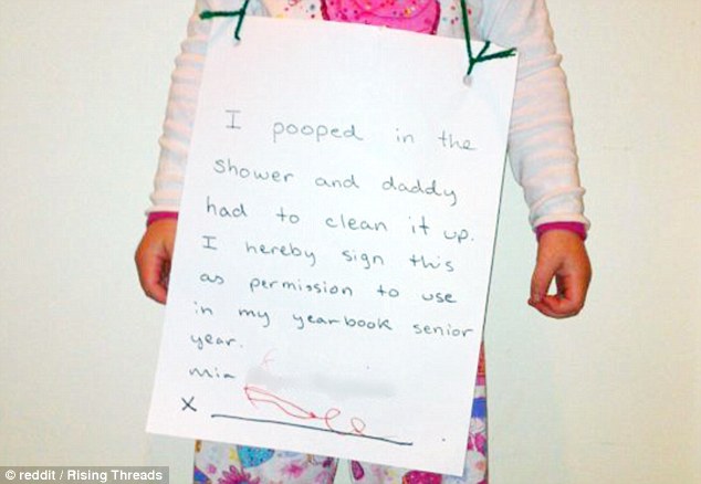 Tags: 'I pooped in the shower', 'I pooped in the shower' controversy, 'I pooped in the shower' sign, child that pooped in shower, father posting a photograph of his daughter with a sign that said 'I pooped in the shower', I hereby sign this as permission to use in my yearbook senior year.', I pooped in the shower and daddy had to clean it up, intentions were merely to connect with other parents, Parenting
