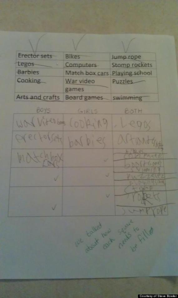 Based on the image alone, Bowler tweeted that it looked like his daughter’s class was asked to sort activities and products like “Barbies” and “Erector sets” into gender columns. She crowded all the answers into a column labeled “Both,” and the teacher wrote at the bottom, “We talked about how each square needs to be filled in.”