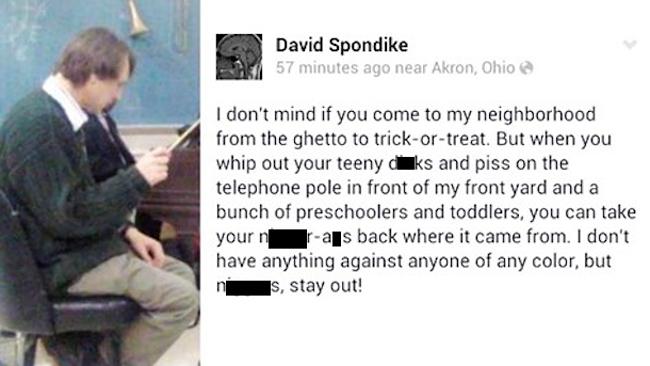 David Spondike, a 51-year-old teacher at Firestone High School in the state of Ohio, logged onto the social networking site and unleashed a diatribe against kids from the “ghetto” who had caused trouble trick-or-treating outside his house, Akron News Now reported.