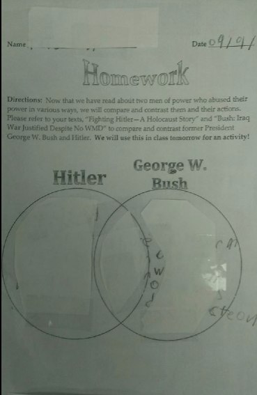 The assignment at McKinley Middle School asked sixth graders to compare the two figures in a Venn diagram, according to USA Today. Instructions say students “have read about two men of power who abused their power in various ways,” and asks them to refer to the articles “Fighting Hitler -– A Holocaust Story,” and “Bush: Iraq War Justified Despite No WMD.”