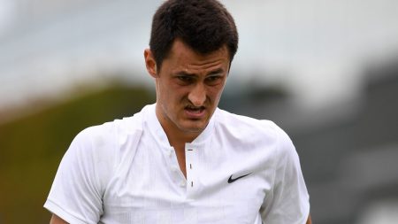 Australia’s Bernard Tomic reacts against Germany’s Mischa Zverev during their men’s singles first round match on the second day of the 2017 Wimbledon Championships at The All England Lawn Tennis Club in Wimbledon, southwest London, on July 4, 2017. / AFP PHOTO / Justin TALLIS / RESTRICTED TO EDITORIAL USE (Photo credit should read JUSTIN TALLIS/AFP/Getty Images)
