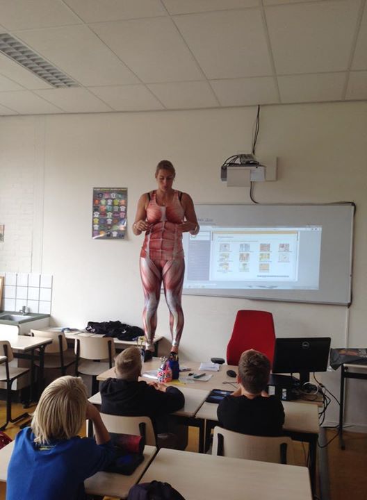 Rather than expose her outer body in a bikini, she wore another type of revealing swimsuit – a full-body wetsuit printed head-to-toe with a diagram of the human anatomy.