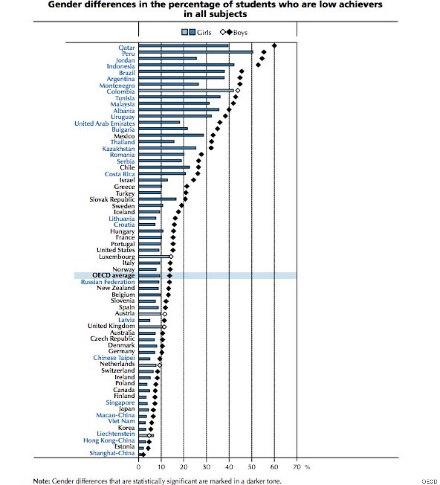 Overall, the report highlights the increasing gap between male and female academic achievement — and shows that young women are often performing better than their male peers. Girls are now going to school longer than boys and significantly outperform boys in reading. Across countries examined in the report, boys are more likely to post low scores in math, reading and science.