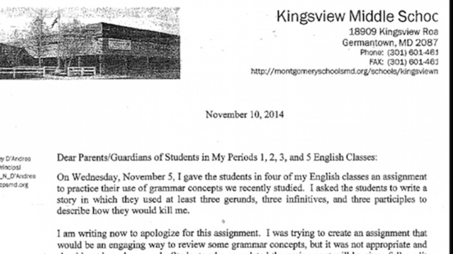 Last November, the Maryland English teacher decided to set an unorthodox assignment asking her students to describe how they would kill her.