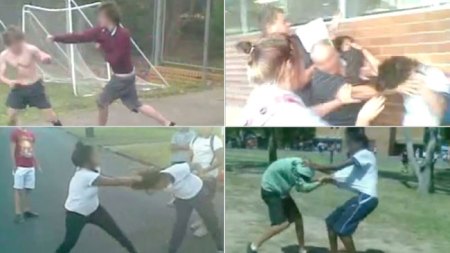 The fights occur in school grounds with classrooms and teachers in sight and on soccer fields and parks. Each clip lasts between 14 and 40 seconds.